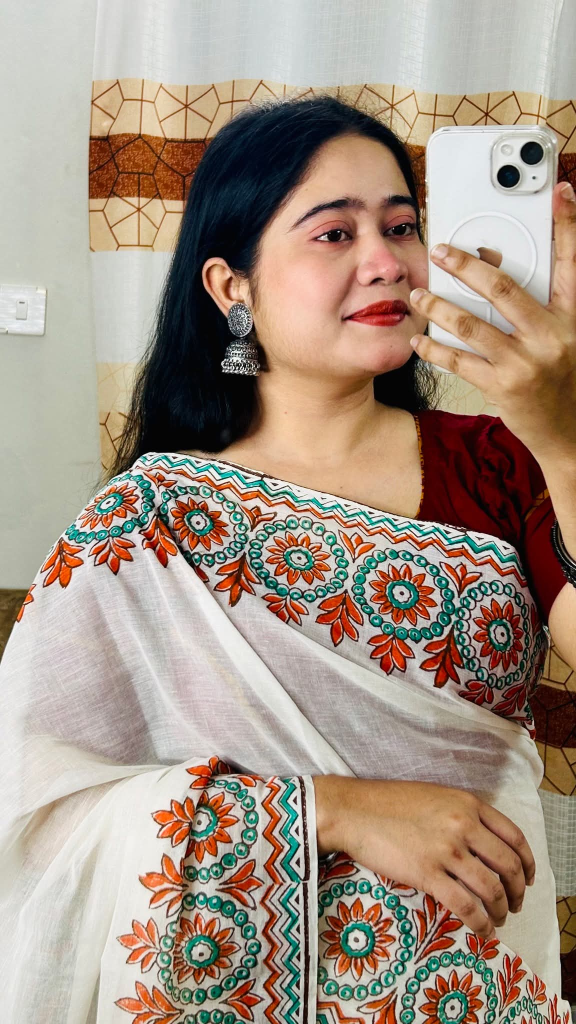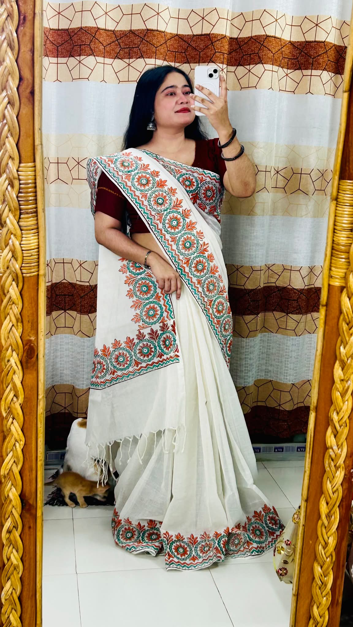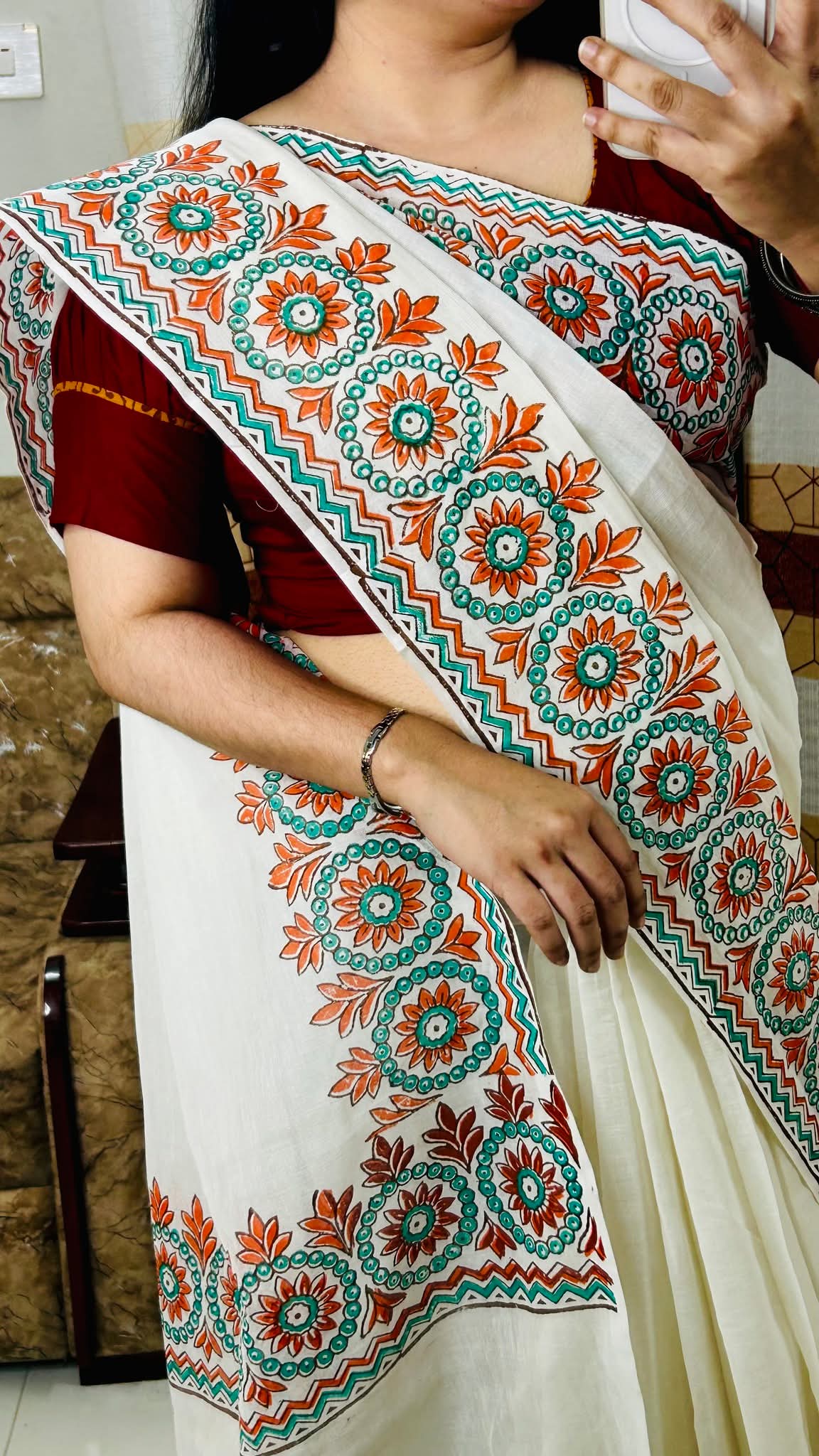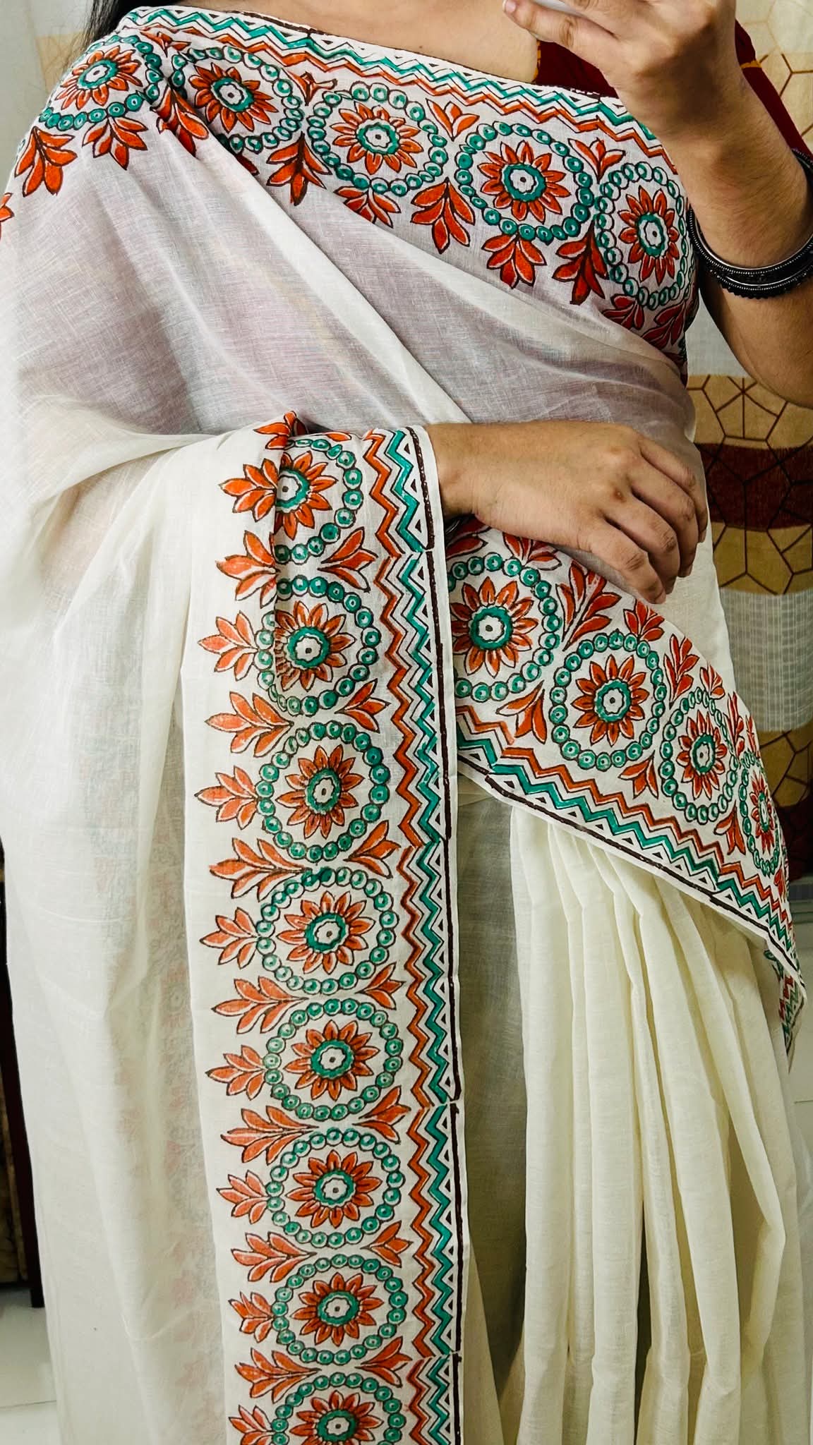 এই দৃষ্টিনন্দন অফ-হোয়াইট কটন শাড়িটি ঐতিহ্য ও আধুনিকতার এক অপূর্ব সমন্বয়। শাড়ির পাড় ও আঁচলে সুন্দর হ্যান্ডপেইন্টেড ফ্লোরাল ও জ্যামিতিক ডিজাইন ব্যবহার করা হয়েছে, যেখানে কমলা ও সবুজ রঙের মনোমুগ্ধকর নকশা শাড়িটিকে দিয়েছে এক অনন্য সৌন্দর্য।
