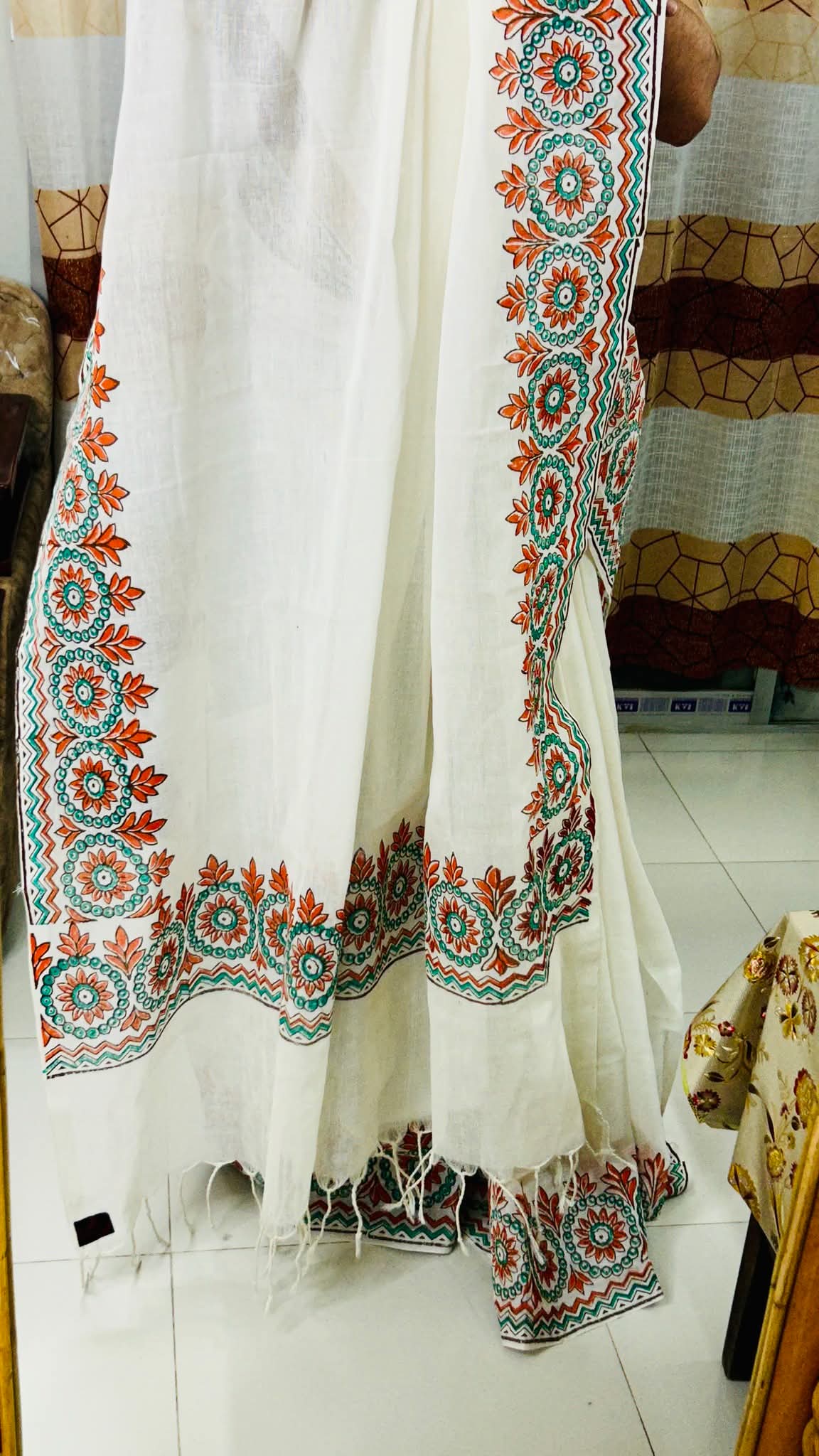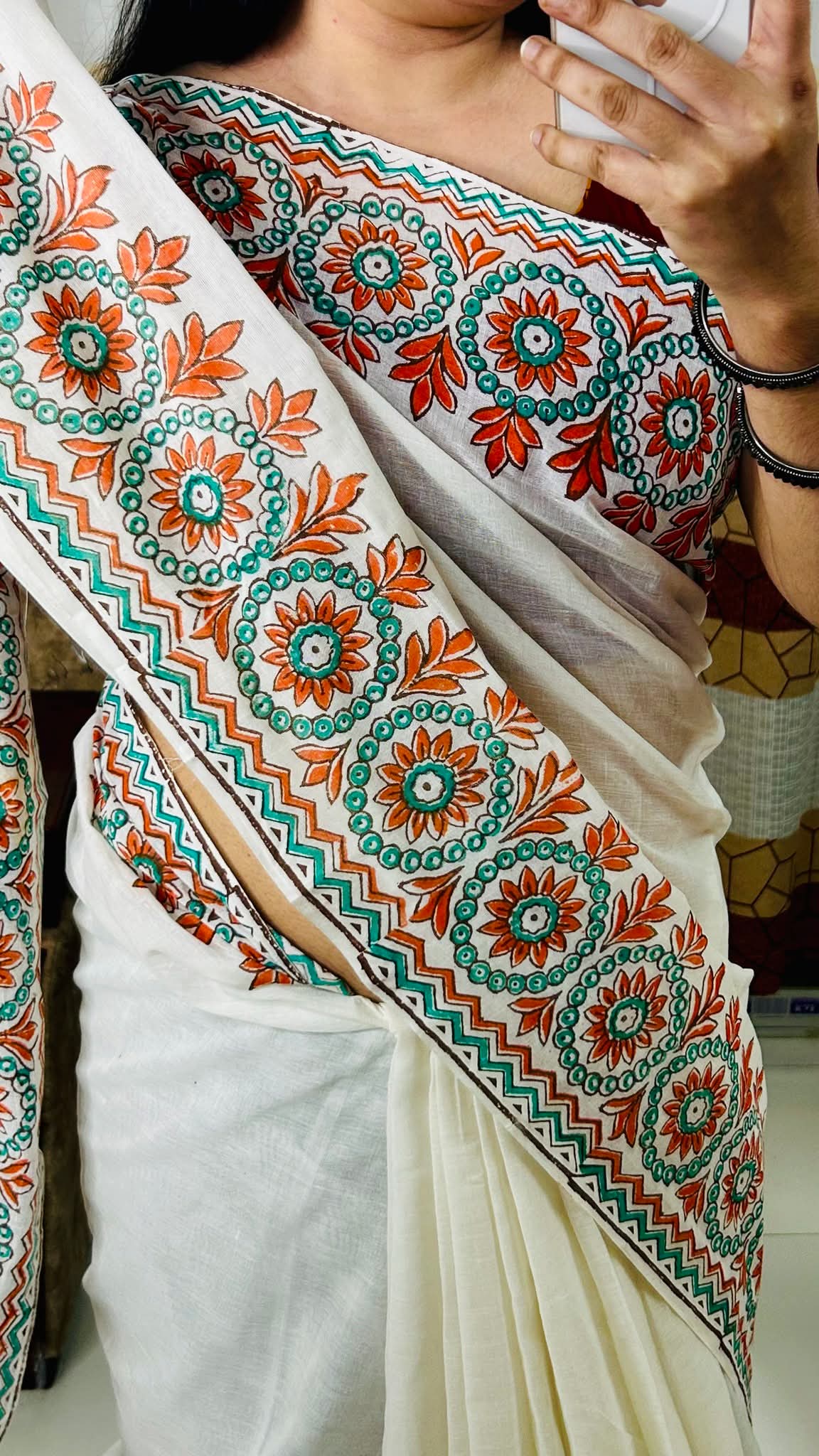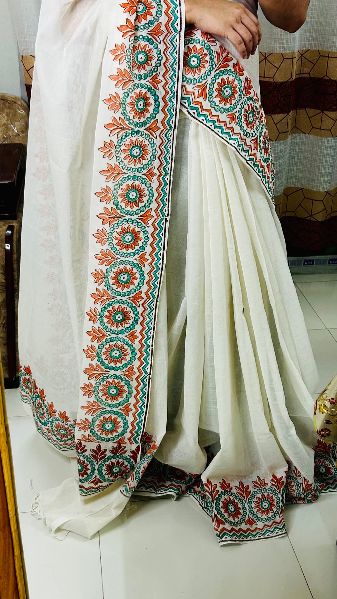 অফ-হোয়াইট সফট কটন শাড়ি, সুন্দর কমলা ও সবুজ হ্যান্ডপেইন্টেড ফ্লোরাল বর্ডার ডিজাইনে তৈরি। হালকা, আরামদায়ক এবং উৎসব বা দৈনন্দিন ব্যবহারের জন্য একদম পারফেক্ট।